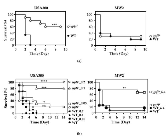 Previously, Kiriukhin et al. and Ryuno et al. reported that the ypfP-knockout mutation increased the LD50 of S. aureus RN4220 approximately threefold in murine and silkworm infection models, respectively [,]. However, in our animal experiment, the ypfP mutation decreased the bacterial virulence in USA300 but not in MW2 (Figure 5a), demonstrating that the virulence contribution is strain dependent.