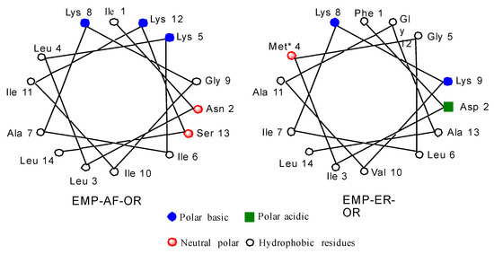 Schiffer and Edmunson alpha helix wheel projection of EMP-AF-OR and EMP-ER-OR peptides.