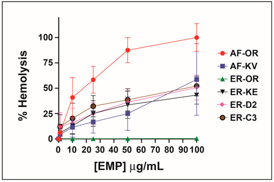 When Konno first studied the biological properties of the peptide EMP-AF he reported induced hemolysis in human erythrocytes but he found a potency one-third of mastoparan though he shows a 75% release at concentrations of 0.5 μg/m. Other synthetic analogs of EMP-AF showed only weak hemolytic activity [28]. In our study, the original peptide (called here EMP-AF-OR) shows the highest hemolytic activity with 100% hemolysis at 0.1 μg/mL. For EMP-ER, Konno reports 100% hemolysis for a concentration of 0.5 μg/mL and about 50% for 0.18 μg/mL [33]. In our test, we found a similar activity for EMP-ER-OR and the studied peptide analogs against erythrocytes under the conditions and concentrations tested and there is a clear trend of increasing hemolysis with increasing concentrations. (Figure 2)