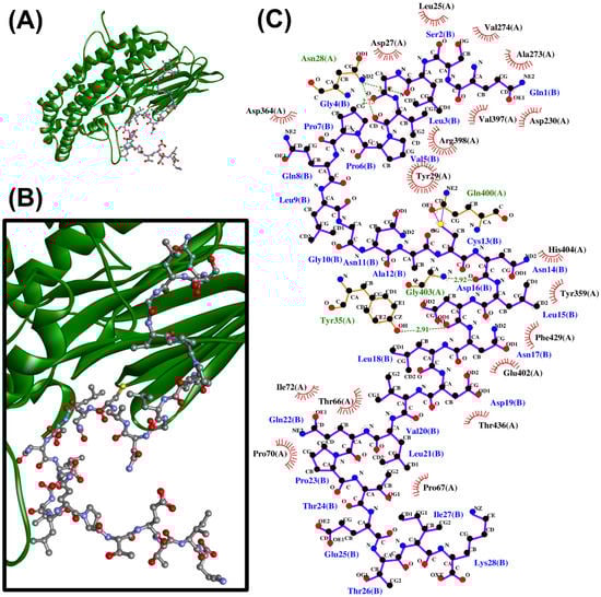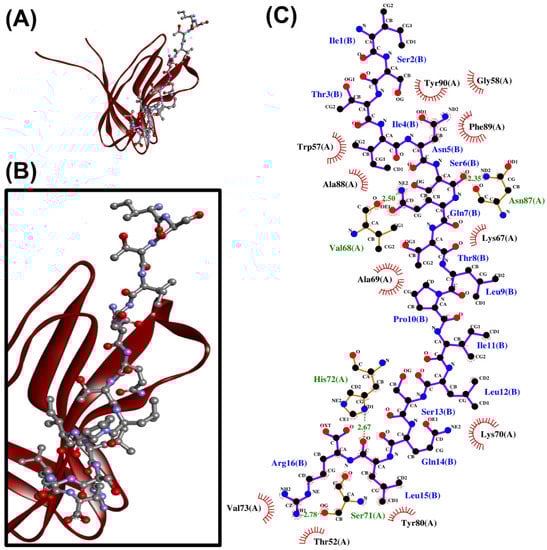 The ISTINSQTLPILSQLR-PirAvp docked model presented in 3D (A,B) and 2D (C) diagrams. In (A,B), PirAvp is shown in the cartoon in maroon; ISTINSQTLPILSQLR is presented in a ball-and-stick style. In the 2D diagram (C), the hydrophobic bonds and hydrogen bonds are displayed in red spoked arcs and green dashed lines, respectively.