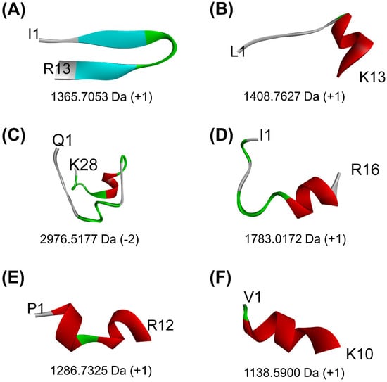 The 3D structures of six peptides predicted to bind to the key regions of both PirAvp and PirBvp that are involved in PirAvp/PirBvp complex formation: (A) ISYVVQGMGISGR, (B) LTFVVHGHALMGK, (C) QSLGVPPQLGNACNLDNLDVLQPTETIK, (D) ISTINSQTLPILSQLR, (E) PQFLVGASSILR, and (F) VQVVNHMGQK. The alpha-helical elements are shown in maroon, whereas the beta-strands are shown in light blue. Only the N- and C-terminal residues of each peptide are indicated. Values below each structure represent the molecular mass and the net charge of the peptide, as computed by PepDraw.