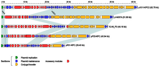 Linear comparison of plasmid genome sequences. Genes are denoted by arrows. The plasmid backbone replication, maintenance, and conjugation regions are colored in green, dark blue, and orange, respectively. The accessory module regions are colored in red. Shading denotes homology (nucleotide identity ≥ 90%) of the plasmid backbone regions, but not the accessory modules. RepA and orf207 represent the names of the labeled genes, respectively. The GenBank accession numbers of p1011-KPC2, p14057A, YLH6_P3, pP23-KPC, and pR31-KPC are MH734334, KY296095, MK882885, CP065418, and CP061851, respectively.