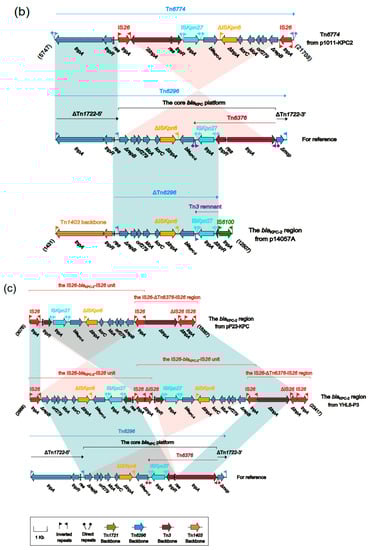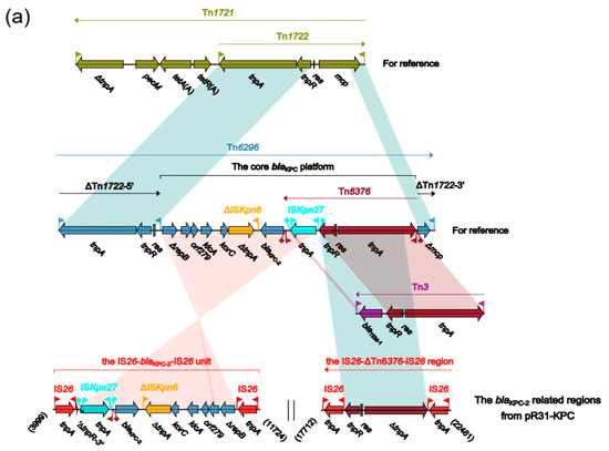 Tn6296 is widely considered to be one of the most important vehicles for blaKPC-2 gene transferring. Tn6296 was originally identified in MDR plasmid pKP048 from Klebsiella pneumoniae. In addition, it was generated from the insertion of the core blaKPC-2 genetic platform (Tn6376–blaKPC-2–ΔISKpn6–korC–orf6–klcA–ΔrepB) into Tn1722, resulting in truncation of mcp (Figure 2a).