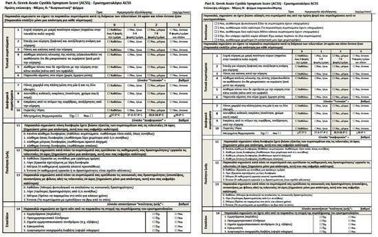 For reasons stated above, AC must be carefully evaluated either individually or collectively. Well-drawn disease-specific questionnaires are easy-to-handle self-evaluation tools and may serve as appropriate smart instruments for gathering information from a large population of people within a short time. For this reason, they should be designed in such a way that data can be collected with the most optimal accuracy and the results are interpretable and generalisable. The Acute Cystitis Symptom Score (ACSS) was properly designed as an evaluation tool for AC. It is a simple and standardised self-reporting questionnaire assessing typical and differential symptoms, burden of symptoms, quality of life and evaluating possible changes in subjective well-being after treatment. It was originally developed in the Uzbek and Russian languages and has demonstrated high reliability and validity [,]. The present study was aimed to develop a Greek version of the ACSS questionnaire for clinical research, diagnosis of primary AC and monitoring the outcome and effectiveness of the treatment.