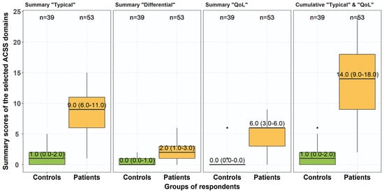 The severity of the majority of symptoms and their negative impact on the quality of life were significantly higher in the group of patients than in controls. Similar results were found for the summary scores of all three domains and the cumulative summary scores for the ‘typical’ and ‘QoL’ domains, as well as for the total score of the ACSS (Table 4, Figure 2).