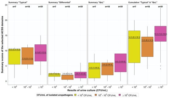 In patients, there was, however, no correlation between the amount of bacteriuria and summary scores of the different ACSS domains (Figure 3).