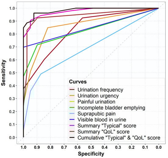 The largest AUC in the ROC-curve analysis for individual ACSS items, corresponding to the most optimal diagnostic ability, was found for ‘urinary urgency,’ which was also confirmed by the diagnostic odds ratios (Figure 4 and Figure 5a). However, a higher balance for diagnostic sensitivity and specificity was found for the cumulative score of the ‘typical’ and ‘QoL’ domains, followed by the summary score of the ‘typical’ and ‘QoL’ domains which were higher than the AUC of the individual typical symptoms (Figure 4).