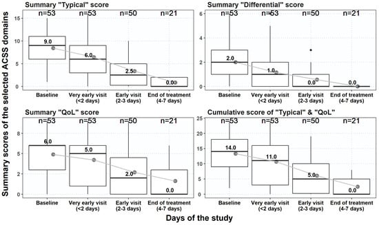The course of changes in summary scores of the different ACSS domains and cumulative scores in patients at baseline and different days of follow-up visits. Boxplots (IQR, mean ± SD).