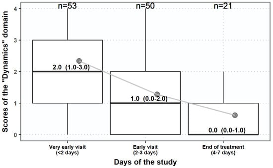 All patients (n = 53) were treated and followed up to 7 days or shorter if they became asymptomatic earlier. Antimicrobial therapy was prescribed to 44 (83.0%) of them, whereas non-antimicrobial therapy was prescribed to 4 (7.5%), and combination therapy to 5 (9.4%) (Table 1). The summary scores of the ‘typical’ and ‘QoL’ domains were reduced during the follow-up visits as well as their cumulative score accordingly. Nevertheless, the reduction in scores was relatively faster for the ‘typical’ domain than for ‘QoL’ (Figure 6). This is similarly reflected by the reduction of the overall assessment by the ‘dynamics’ domain in patients at the three follow-up visits (Figure 7).