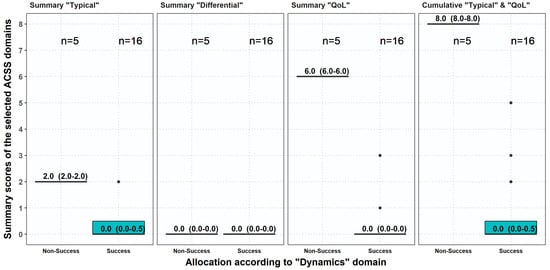 Comparison between ‘success’ and ‘non-success’ obtained in the ACSS domain ‘dynamics’ with the results obtained by summary scores in the ACSS domain ‘typical’, ‘QoL’ and by the cumulative summary of both domains. Boxplots (IQR, mean + SD).