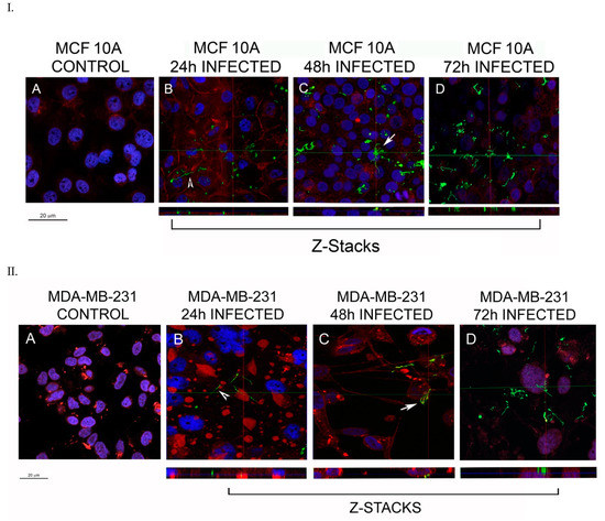 MCF 10A and MDA-MB-231 cells (4 × 104/well) were grown on sterile 4-well chamber slides (ThermoFisher Scientific) for 24 h. The cells were then washed with 1X phosphate buffer saline (PBS, PH 7.4) after 24 h and were infected with B. burgdorferi B31, at a multiplicity of infection (MOI) of 60, resuspended in 1 mL of co-culture media. Uninfected cells grown in co-culture media were used as a negative control. The uninfected and infected normal and breast cancer epithelial cells were incubated for 4, 24, 48, and 72 h at 37 °C, 5% CO2. After the infection, the co-culture media was removed, and cells were washed twice with 1× PBS pH 7.4. The infected cells were treated with 10 µg/mL of Cell tracker CM-Dil dye (ThermoFisher Scientific, Waltham, MA, USA, C7001) diluted in 1× PBS pH 7.4 to stain the epithelial cells. The cells were incubated at 37 °C for 5 min and then transferred to 4 °C for 15 min. The dye was then aspirated, and the cells were washed once with 1× PBS pH 7.4, then fixed using cold methanol for 5 min at −20 °C. The methanol was aspirated, and cells were washed once with 1× PBS pH 7.4. The cells were then treated with a 1:200 dilution of a FITC labeled polyclonal rabbit anti-Borrelia burgdorferi antibody (PA-1-73005, Thermo Scientific) to stain B. burgdorferi and incubated at 37 °C for 30 min. The cells were then washed 3× with 1× PBS pH 7.4 and a 1:1000 dilution of 4′,6-diamidino-2-phenylindole (DAPI, ThermoFisher Scientific, Waltham, MA, USA) in 1× PBS pH 7.4 was added to the cells to stain the nucleus of the cells. The cells were incubated for 5 min at room temperature (RT), washed once with 1× PBS pH 7.4, and mounted with VECTASHIELD Antifade Mounting Medium (VECTOR Laboratories, Burlingame, CA, USA). Z-stacks of the stained cells were generated at a magnification of 630× using Leica SP8 confocal microscope along with Leica Application Suite X software for image processing (Yale University, West Campus Microscopy Facility, West Haven, CT, USA).