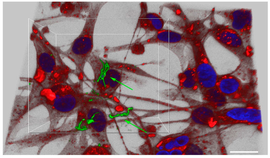 B. burgdorferi was also shown to be able to attach and invade MDA-MB-231 cells within 24 h and localize in the cytoplasm (Figure 1, Panel II). For MDA-MB-231, on average, about 89% of cells were invaded by B. burgdorferi spirochetes within 24 h while 92% of spirochetes invaded the mammalian cells at 48 h and 96% at 72 h (Table 1, Figure 1, Panel II B-D). Some of the spirochetes clearly formed small aggregates after 48 h of infection (Figure 1, Panel IIC, white arrow) which was also demonstrated by an enhanced confocal image near the cell nucleus (Figure 2, see also the Supplemental Video S1). However, 72 h after infection, most of the invading spirochetes were located in the cytoplasm, and some spirochetes were close to the nucleus (Figure 1, Panel II). Comparing the significance of the invasion of B. burgdorferi spirochetes into MDA-MB-231 and the normal MCF 10A cells, significant differences (p-values < 0.05) were found at each time point.