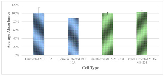 The effect on cell proliferation of MCF 10A an MDA-MB-231 epithelial cells after infection with B. burgdorferi versus uninfected breast epithelial cells after 72 h determined by a cell viability assay as described in Material and Methods. The error bar represents a standard error of mean (SEM). All experiments were performed a minimum of three independent times with at least six samples per experiment (n = 18).