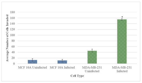 Quantitative analysis of the Matrigel-based invasion assay of normal MCF 10A and neoplastic MDA-MB-231 cells infected with B. burgdorferi compared to uninfected cells after 72 h using 2 mg/mL concentration of Matrigel as described in Material and Methods. The p-value of the data < 0.05 is considered significant and is indicated by *. The error bar represents a standard error of mean (SEM). All experiments were performed a minimum of three independent times with at least six samples per experiment (n = 18).