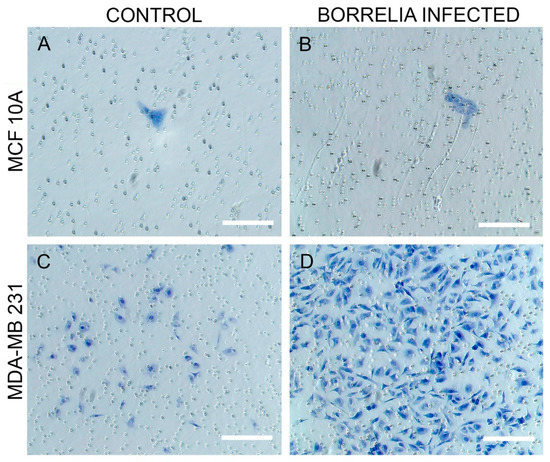 Matrigel-based invasion assay of (A) MCF 10A uninfected cells versus (B) MCF 10A after infection with B. burgdorferi, and (C) MDA-MB-231 uninfected cells versus (D) MDA-MB-231 after infection with B. burgdorferi after 72 h using 2 mg/mL concentration of Matrigel as described in Material and Methods. Scale bar: 200 μm.