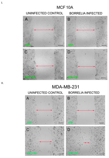 The migration rates of the B. burgdorferi-infected epithelial cells were analyzed using a standard wound healing assay [21] and compared to uninfected cells. The highest change in the rate of migration was observed for the 48 h B. burgdorferi infected MCF 10A and MDA-MB-231 cells, 6 h after the wound was induced (Figure 6). For MCF 10A cells, the 48 h B. burgdorferi infected cells showed an approximate 10% increase in the rate of migration after 6 h of inducing the wound, while the non-infected MCF 10A cells also showed an approximate 10% increase in migration to close the wound (Figure 6, Panel I, Figure 7). On the other hand, the 48 h B. burgdorferi infected MDA-MB-231 showed a significant 48% wound recovery (p-value < 0.05) while the uninfected cells showed a 27% change in the rate of migration after 6 h of inducing the wound (Figure 6, Panel II, Figure 7).