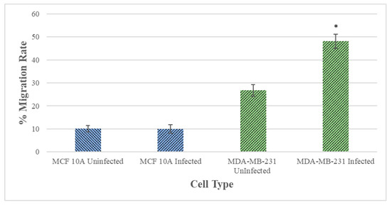 Quantitative analysis of wound healing assay of MCF 10A and MDA-MB-231 epithelial cells after 48 h of infection with B. burgdorferi and 6 h of recovery (48 h + 6 h). The cells were infected for 48 h with B. burgdorferi and then a wound was induced, and cell migration was quantified after 6 h of recovery as described in Material and Methods. The error bars represent the standard error of mean (SEM). The p-value of the data < 0.05 is considered significant and is indicated by *. All experiments were performed a minimum of four independent times with at least three samples per experiment (n = 12).
