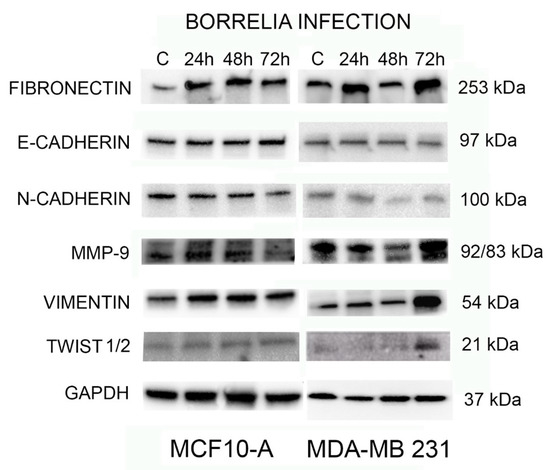 To further investigate the effect of B. burgdorferi in inducing EMT in normal and tumorigenic breast epithelial cells, the expression of common EMT-inducing transcription factors like fibronectin, E-Cadherin, N-Cadherin, MMP-9, Vimentin, and Twist1/2 with GAPDH as the loading control was analyzed using Western blot analyses. The protein from uninfected and 24, 48, and 72-h B. burgdorferi infected MCF 10A and MDA-MB-231 cells was analyzed using Western blot (see Section 4).