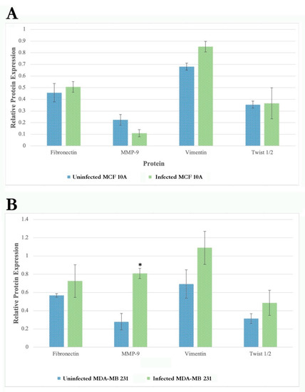 Quantification and statistical analyses of three independent Western blot experiments for the expression levels of Fibronectin, Activated MMP-9, Vimentin, and Twist1/2, as described in Materials and Methods, in uninfected and 72 h infected MCF 10A (Panel A) and MDA-MB-231 cells (Panel B). Expression levels of the target proteins were normalized for the loading control GAPDH housekeeping protein. Statistical analyses were performed to find significant differences in protein expression level in infected cells compared to uninfected cells as described in Material and Methods. The error bars represent standard error of mean (SEM). The p-value of the data < 0.05 is considered significant and is indicated by *.