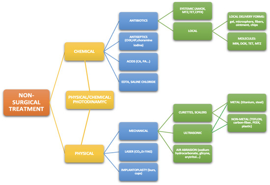 Non-surgical treatment methods of peri-Implantitis and peri-Implant mucositis. Legend: AMOX: amoxicillin, CA: citric acid, CHX: chlorhexidine, CPFX: ciprofloxacin, DOX: doxycycline, HP: hydrogen peroxide, MIN: minocycline, MTZ: metronidazole, PA: phosphoric acid, TET: tetracycline.