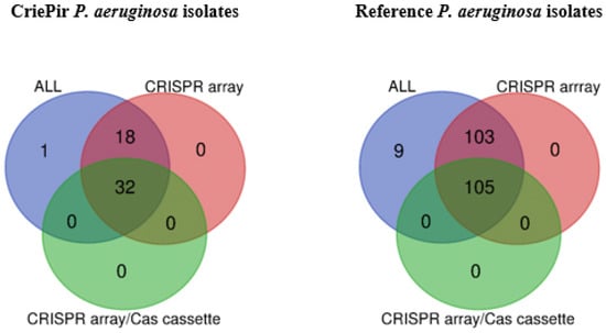 Venn diagrams of CRISPR/Cas element distribution for CriePir P. aeruginosa isolates sequenced by us (left) and reference isolates available from Pseudomonas genome DB (right).