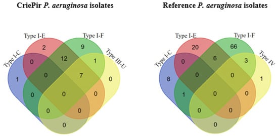 Venn diagrams of CRISPR/Cas system type distribution for CriePir (left) and reference (right) P. aeruginosa isolates.