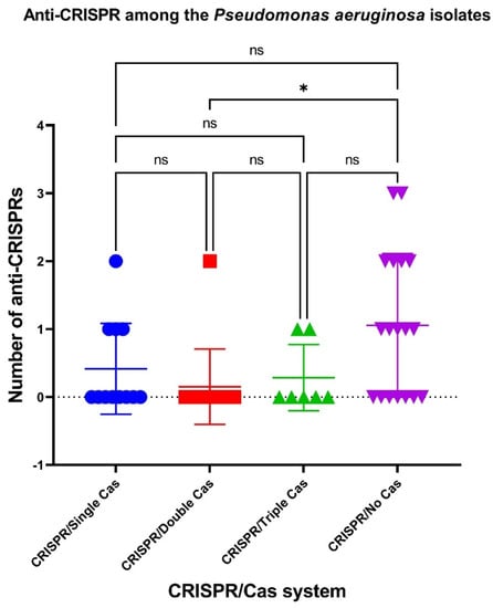 It was shown that the number of anti-CRISPRs was significantly (p ˂ 0.05) higher in P. aeruginosa isolates without cas cassettes (“CRISPR/No Cas” group) than in “CRISPR/Double Cas” isolates (Figure 4).