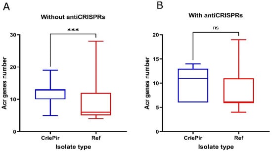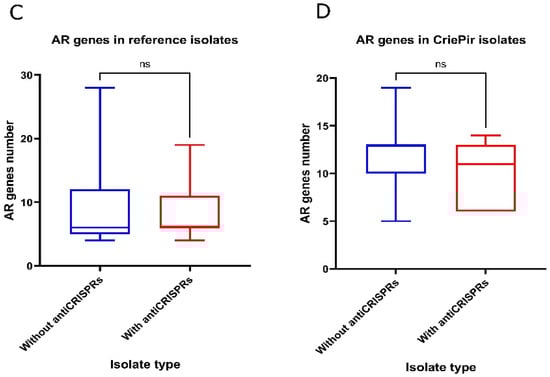 The large-scale research by Shehreen et al. [10] showed that, in P. aeruginosa, the presence of anti-CRISPRs was associated with antibiotic resistance genes. The authors suggested that anti-CRISPR proteins tended to coexist with AR genes in antibiotic-resistant bacteria by reducing the ability of CRISPR/Cas systems to prevent the acquisition of AR genes. In our study, we assessed the number of AR genes in CriePir and the reference isolates with and without the antiCRISPR genes (Figure 5).