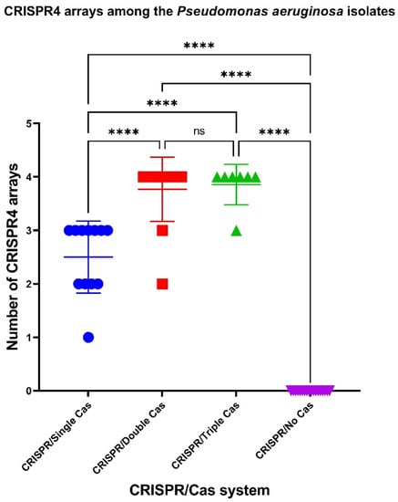 To assess the characteristics of the putative CRISPR/Cas systems of P. aeruginosa, containing both CRISPR arrays and cas genes, the isolates under investigation were further characterized by CRISPR array types. It was shown that CriePir P. aeruginosa isolates carrying CRISPR/Cas systems with multiple cas cassettes had significantly more CRISPR4 arrays (the most reliably predicted CRISPRs) [38] (Figure 6).