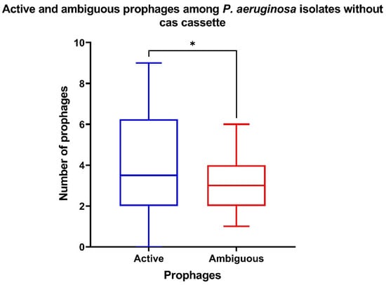 The number of active and ambiguous prophages among CriePir P. aeruginosa isolates having no cas cassettes. * indicates the level of significance p < 0.05.