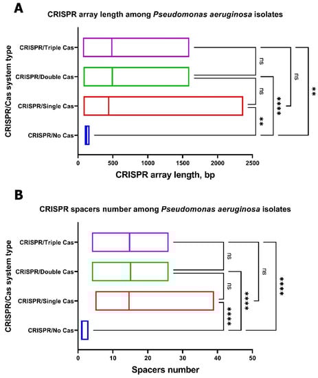 Significant differences in the CRISPR array length and the number of spacers were seen between the “CRISPR/Single Cas”, “CRISPR/Double Cas”, and “CRISPR/Triple Cas” groups as well as the “CRISPR/No Cas” group of P. aeruginosa isolates (Figure 8). Moreover, significant differences in the CRISPR array length and number of spacers were seen between the “CRISPR/Type I-F” and “CRISPR/Type I-E” groups of P. aeruginosa isolates (Figure S7).