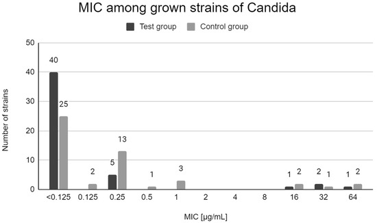 Both in the test group and in the control group, the majority of the grown strains were sensitive to fluconazole. The most common MIC value was x < 0.125 µg/mL. Four strains obtained from 4 patients of the test group (7.7% of samples) and 5 strains obtained from 5 patients of the control group (10.2% of samples) had MIC above 1 µg/mL. Figure 1 shows the MIC values determined for all isolated Candida strains.