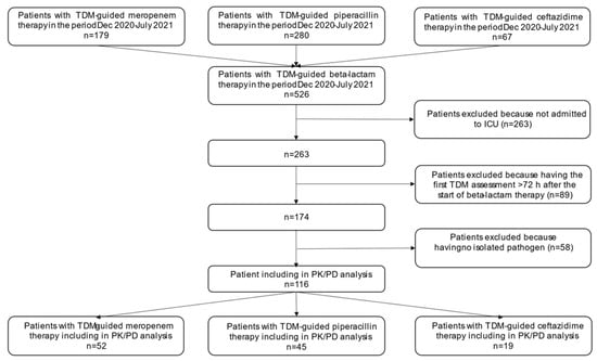 Flowchart of patient inclusion and exclusion criteria. ICU; intensive care unit; PK/PD: pharmacokinetic/pharmacodynamic; TDM: therapeutic drug monitoring.