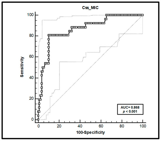 Receiver operating characteristic (ROC) curve analysis. An optimal cut-off of Css/MIC ≤ 5 was found, resulting in a sensitivity of 80.8% and a specificity of 90.0%. The optimal cut-off point was computed using the Youden Index method. AUC: area under the curve; Css: steady-state concentrations.