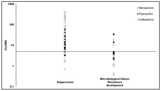 Relationship between beta-lactam PK/PD target attainment (Css/MIC) and microbiological failure and/or resistance development. Each point represents a single critically ill patient treated with selected beta-lactams. Dotted line represents optimal PK/PD cut-off (Css/MIC = 5) identified at ROC analysis. Significantly higher risk of microbiological failure and/or resistance occurrence was found in patients with a Css/MIC below the optimal cut-off (p < 0.001). Css: steady-state concentrations.