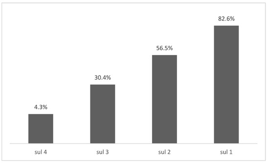 The most searched sulfonamide-resistance genes were: sul1 with 19 studies (82.6%), sul2 with 13 studies (56.5%), while the least searched genes were sul3 with 7 studies (30.4%), and sul4 with 1 study (4.3%) (Figure 2). The sul1 gene was found in 18 of 19 studies that searched for this gene, and its presence in Salmonella spp. strains varied from 0 to 89.7% (average of sul1 gene in isolates = 45.6%). The sul2 gene was found in 12 studies and its presence in Salmonella spp. strains varied from 0 to 97.8% (average of sul2 gene in isolates = 44.5%). The sul3 gene was found in six studies and its presence in Salmonella spp. strains varied from 0 to 85.1% (average of sul3 gene in isolates = 31.6%) (Table 3).