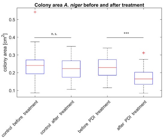 Colony area of mycelial patches of A. niger before and after treatment. The plot shows the median and the standard deviation of the colony area. Statistical significance of the area before and after treatment is indicated with no significance (n. s.), p < 0.001 (***). ncontrol = 33, ntreatment = 60.
