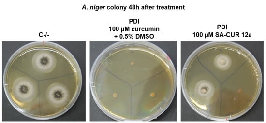 A. niger 48 h after PDI treatment. Left: control sample (C−/−), Middle: PDI treated samples with 100 µM curcumin + 0.5% DMSO, Right: PDI treated samples with 100 µM SA-CUR 12a.