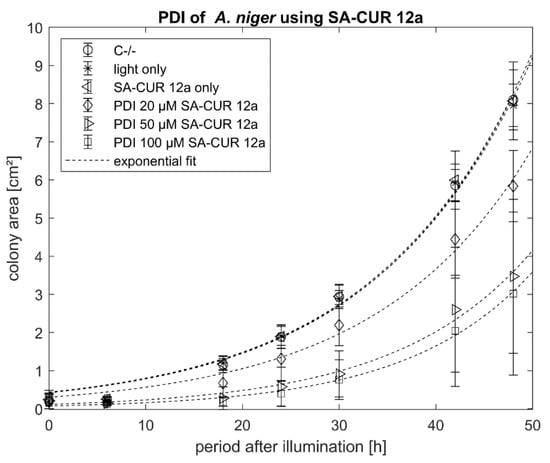 The cationic SA-CUR 12a did not induce any dark toxicity (Figure 7). The highest phototoxicity of SA-CUR 12a was observed at a concentration of 100 µM with a mean colony area after 48 h of 3.0 mm2. At lower concentrations, the photoantimycotic effect was less pronounced with decreasing concentration of SA-CUR 12a.