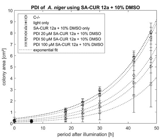 To examine whether the phototoxicity of SA-CUR 12a can be increased with DMSO, experiments with 10% of this permeability enhancer were performed. For SA-CUR 12a with 10% DMSO, the highest antimicrobial effect of SA-CUR 12a was achieved with 100 µM (mean colony area after 48 h of 3.4 mm2, see Figure 8).