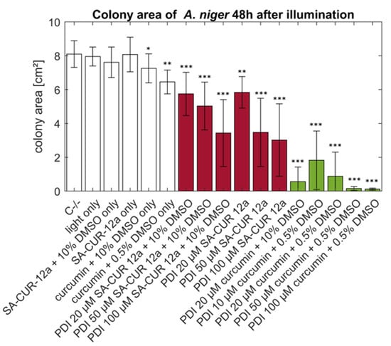 Figure 9 summarizes the colony areas of A. niger 48 h post-treatment. Curcumin in combination with DMSO induces significant (p < 0.05) dark toxicity. The individual treatments do all show a significant decrease in the colony area when compared to C−/−. The lowest effect is seen with 20 µM SA-CUR 12a and the highest with curcumin with 10% DMSO at the concentrations 50 µM and 100 µM, inducing complete growth inhibition.