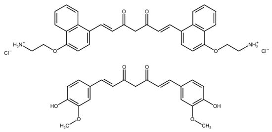 The stock solution (100 mM) of curcumin (Carl Roth, Karlsruhe, >90.6%) was prepared by dissolving in DMSO (Fluka Analytical, Buchs, Switzerland). SACUR-12a [42] was kindly provided by Dr. Andreas Spaeth (Institute of Organic Chemistry, University of Regensburg, Regensburg, Germany). A stock solution (5 mM) of SACUR-12a was prepared in ddH2O. Both stock solutions were stored at −20 °C in the dark until use. The chemical structures of curcumin and SA-CUR 12a [42] are shown in Figure 10.