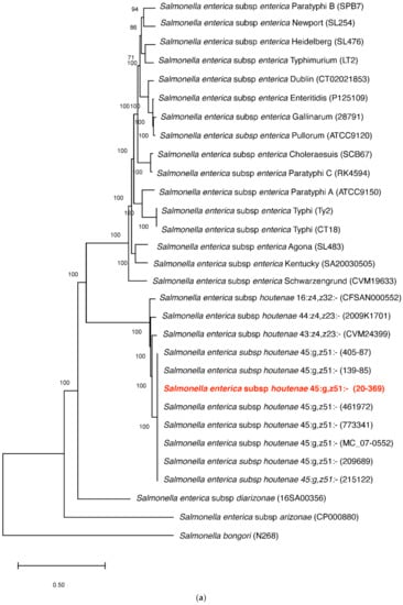 A total of 30 genomes of Salmonella spp. including the complete genome of S. houtenae str. 20-369, 23 complete genomes of Salmonella spp. (S. bongori str. N268, S. enterica subsp. arizonae str. CP000880, S. enterica subsp. diarizonae str. 16SA00356, 16 serotypes of S. enterica subsp. enterica, and three serotypes of S. houtenae), and seven draft genomes of S. houtenae 45:g,z51:- were used for phylogenetic analysis. The seven S. houtenae 45:g,z51:- strains were selected based on confirmation by Seqsero and available information on source, collection year, location, Bioproject ID and Biosample ID and their FASTA-formatted contigs were downloaded from EnteroBase (http://enterobase.warwick.ac.uk/species/index/senterica, accessed on 15 March 2021). The information on ten S. houtenae strains used for phylogenetic analysis is shown in Supplementary Table S1.