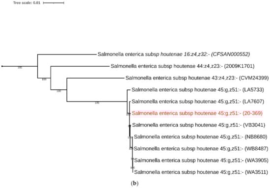 The S. houtenae str. 20-369 was assigned to serotype IV 45:g,z51:- or IIIa 45:g,z51:- using the SeqSero tool (Salmonella Serotyping by Whole Genome Sequencing). In the maximum likelihood (ML) phylogeny, the S. houtenae str. 20-369 clustered with other S. houtenae strains, and the S. houtenae strains formed a well-supported monophyletic clade with high bootstrap value (Figure 1a). In a subtree (Figure 1b), the S. houtenae str. 20-369 clustered with the seven S. houtenae 45:g,z51:- strains with >97% sequence identity.