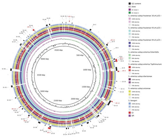 S. enterica subsp. houtenae (S. houtenae) was originally isolated from a cockatiel (Nymphicus hollandicus) in 1978, and 73 serotypes of S. houtenae have been described since [6,7]. S. houtenae inhabits the intestinal tract of reptiles and has been found to be prevalent in terrestrial and aquatic turtles, snakes, land Iguana, Australian sleepy lizards and captive zoo reptiles [1,4,8]. S. houtenae is the most prevalent subspecies identified from 31 cases of Salmonella infection in human with known exposure to reptiles in Germany between 2006 and 2008 [4]. S. houtenae has been reported as an opportunistic pathogen in humans, and some serovar of S. houtenae have been implicated as a source of serious and life-threatening diseases in humans, such as sepsis, meningitis, brain abscesses endocarditis and urinary tract infections that primarily affect children aged less than one year and immunocompromised adults [3,4,5,7,9,10,11,12,13]. However, the pathogenic potential of S. houtenae has been underestimated [14], and there is only very limited genomic information about S. houtenae. As of 8 March 2021, only six complete genome sequences of S. houtenae have been reported in NCBI GenBank database; S. houtenae serotypes 16:z4,z32:-, 44:z4,z23:-, and 43:z4,z23:-, and to our best knowledge, there is only two published reports of genome analysis of S. houtenae but no reports of complete genome analysis [8,14].