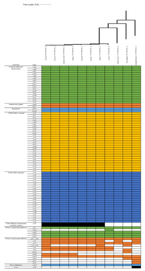 Protein annotations associated with virulence were downloaded from the PATRIC workspace. The virulence profile of S. houtenae str. 20-369 was compared with ten S. houtenae strains using the virulence factor database (VFDB), a reference database for bacterial virulence factors (http://www.mgc.ac.cn/cgi-bin/VFs/genus.cgi?Genus=Salmonella, accessed on 15 March 2021) (Table S1).