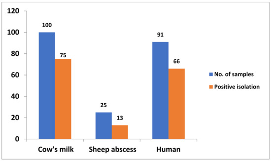 Out of 216 examined samples, 154 Staphylococcus spp. were isolated with a total prevalence of 71.3%. A total of 88 isolates were recovered from animals; 75 from 100 cow milk samples (75%) and 13 from 25 sheep abscesses (52%). Regarding the human samples (n = 91), 66 isolates (72%) were recovered. Wound and abscess samples (n = 30) showed the highest recovery rate, representing 22 isolates (73.3%), followed by dermal lesions (24/33; 72.7%) and tracheal samples (20/28; 71.4%) (Table 1 and Figure 1).