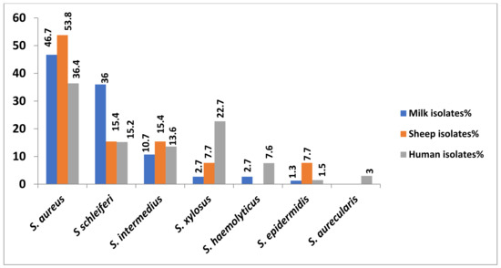 Regarding the animal isolates (n = 88), S. aureus was the most prevalent in the cow milk and sheep isolates with 35 (46.7%) and 7 isolates (53.8%), respectively, followed by S. schleiferi (27; 36% and 2; 15.4%, respectively), S. intermedius (8; 10.7% and 2; 15.4%, respectively) and S. xylosus (2; 2.7% and 1; 7.7%, respectively). Moreover, S. haemolyticus was identified in two milk isolates (2.7%) but was not found in any of the sheep isolates. Finally, one isolate of S. epidermidis was found in each sample (1.3 and 7.7%, respectively). Additionally, S. aureus was the most prevalent species in human isolates (n = 24; 36.4%) followed by S. xylosus (n = 15; 22.7%), S. schleiferi (n = 10; 15.2%), S. intermedius (n = 9; 13.6%), S. haemolyticus (n = 5; 7.6%), S. aurecularis (n = 2; 3%) and finally S. epidermidis (n = 1; 1.5%).