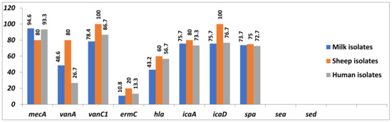 In addition, the spa gene was found in 73.7, 75 and 72.7% of the tested S. aureus isolates, respectively, whilst no isolates harboured the sea and sed genes.