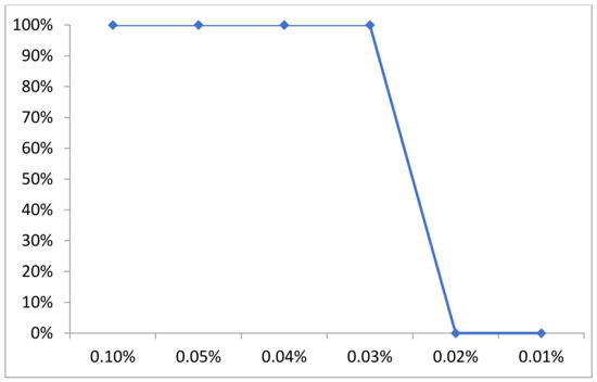 The antibacterial effect of different concentrations of carvacrol EO against 72 MDR Staphylococcus isolates was assessed by agar dilution method according to Radwan et al. [71]. Carvacrol (Sigma Aldrich, Germany) was dissolved in Dimethyl Sulpho Oxide (DMSO) at a ratio 1:9, filtered through a 0.45 µm cellulose filter membrane and then different concentrations (0.1, 0.05, 0.04, 0.03, 0.02 and 0.01%; volume/volume) were separately prepared by the addition of the oil to sterilize the cooled TSA (55 °C), before pouring 10 mL of oil–agar medium in sterile Petri dishes and left to solidify. The tested isolates were grown on TSA at 37 °C for 24 h and then the standard inoculums visually equivalent to the 0.5 McFarland standards (1.5 × 108 CFU/mL) were prepared in physiological saline. Equal amounts of bacterial suspensions were inoculated and speared onto the entire surface of oil agar plates and incubated at 37 °C for 24–48 h. The incubated plates were examined for the growth or inhibition of the bacterial growth detecting the minimum inhibitory concentration (MIC) of carvacrol EO.